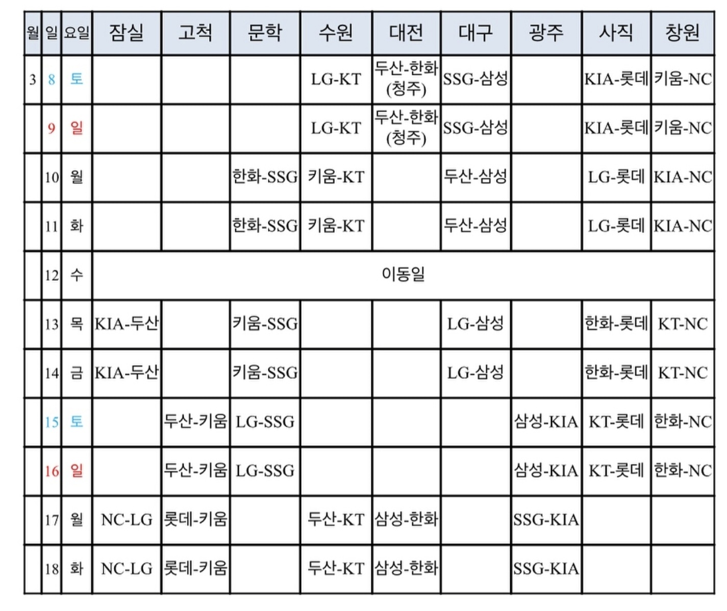 • 고척: 3/8(토) ~ 3/14(금)